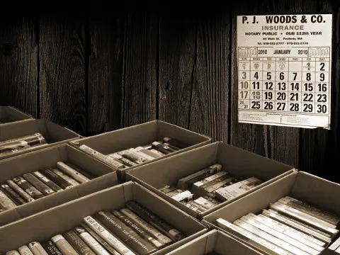 The Shape of Time – “Boxes of Books Beneath Old Calendar” Composite Photo by Deborah Goschy